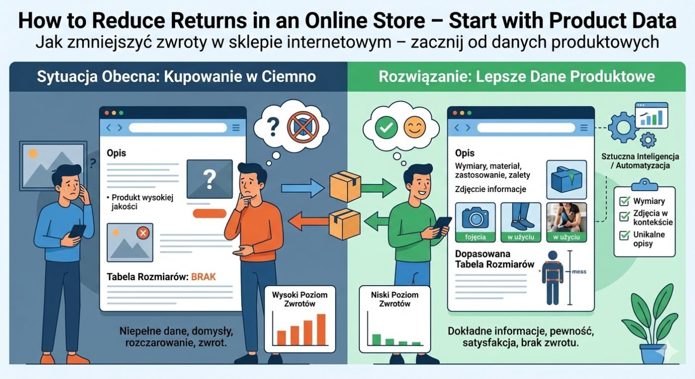 Zwroty rosną, a Ty nie wiesz dlaczego? W wielu sklepach internetowych problem zaczyna się dużo wcześniej niż w momencie, gdy klient klika "zwróć". Zaczyna się wtedy, gdy klient kupuje produkt, o którym właściwie nic nie wie. Pokażemy Ci, dlaczego słabe opisy i niekompletne dane produktowe sprawiają, że klienci kupują w ciemno – i co konkretnie zmienić, żeby zwrotów było mniej.