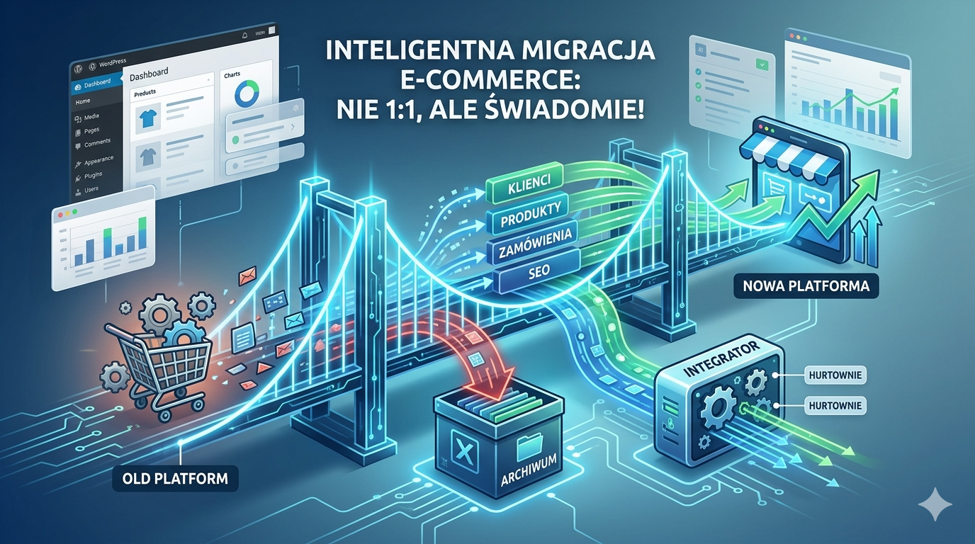 Pracujemy jako integrator łączący sklepy e-commerce z hurtowniami, mamy też doświadczenie w migracjach między platformami. Widzimy to z boku – cały proces, od decyzji do uruchomienia nowego sklepu. Ten artykuł pokazuje, które elementy przenoszą się gładko, gdzie leży największy koszt (zazwyczaj tam, gdzie się go nie spodziewasz) i jak nie zapłacić za migrację rzeczy, których tak naprawdę nie potrzebujesz.